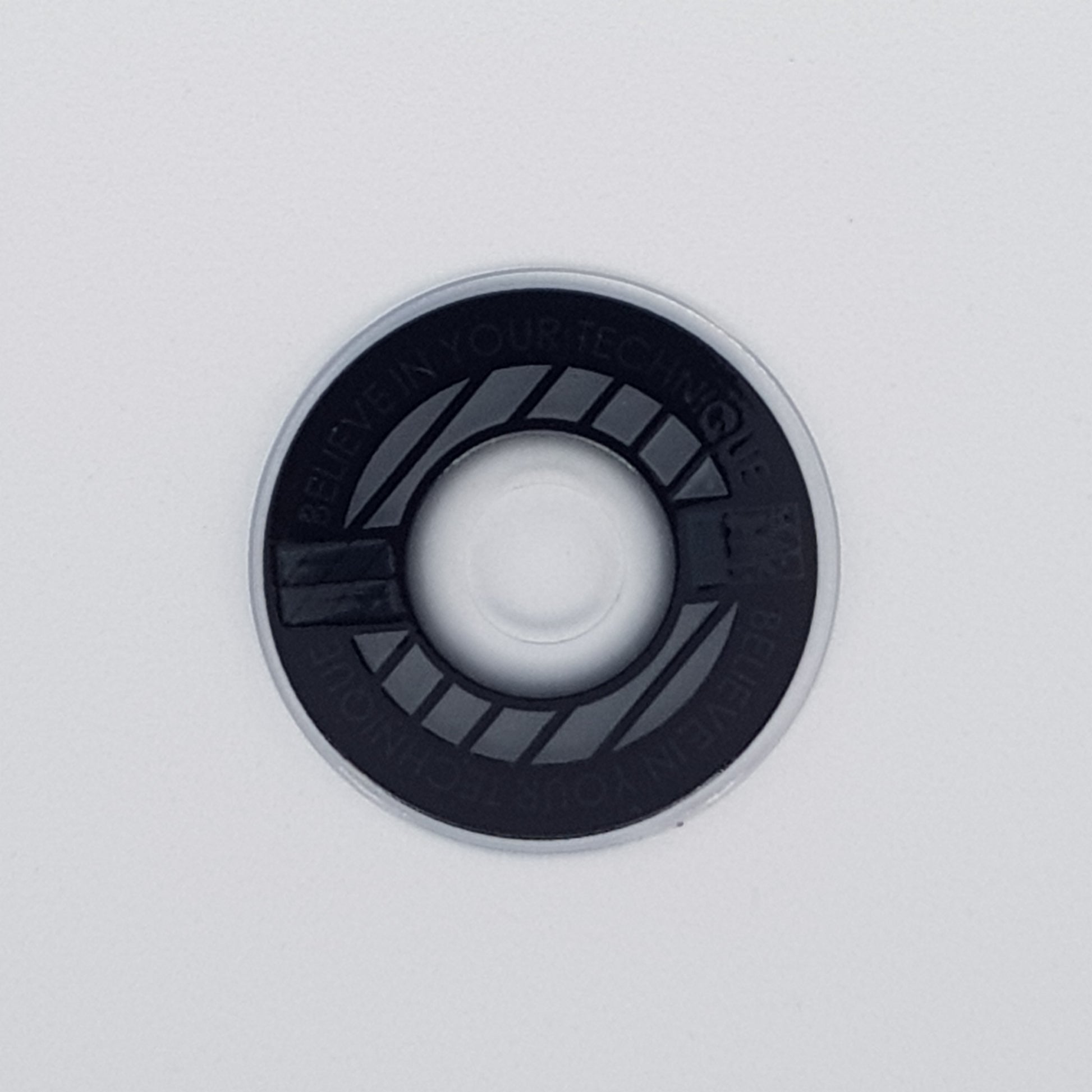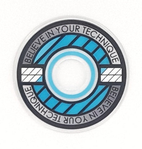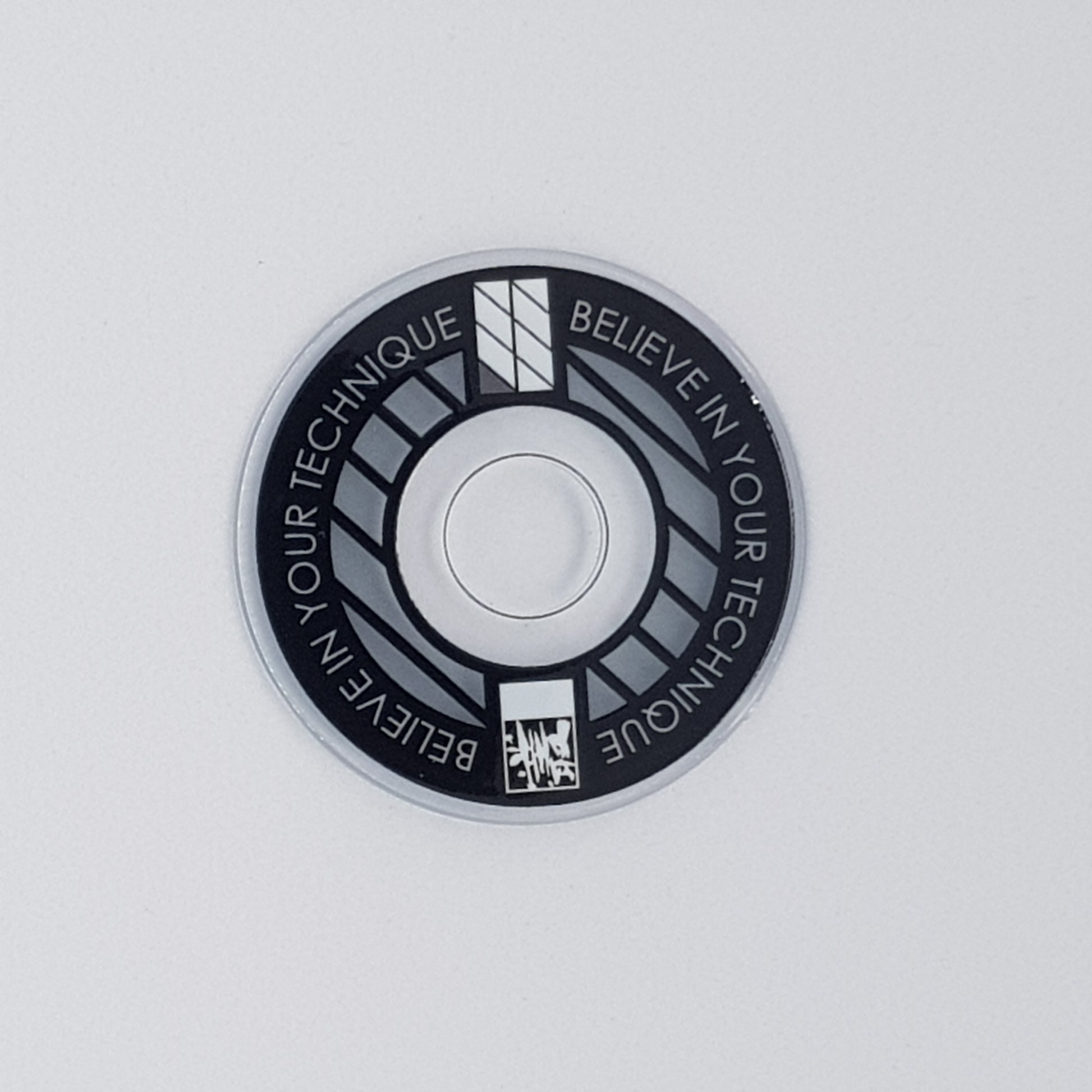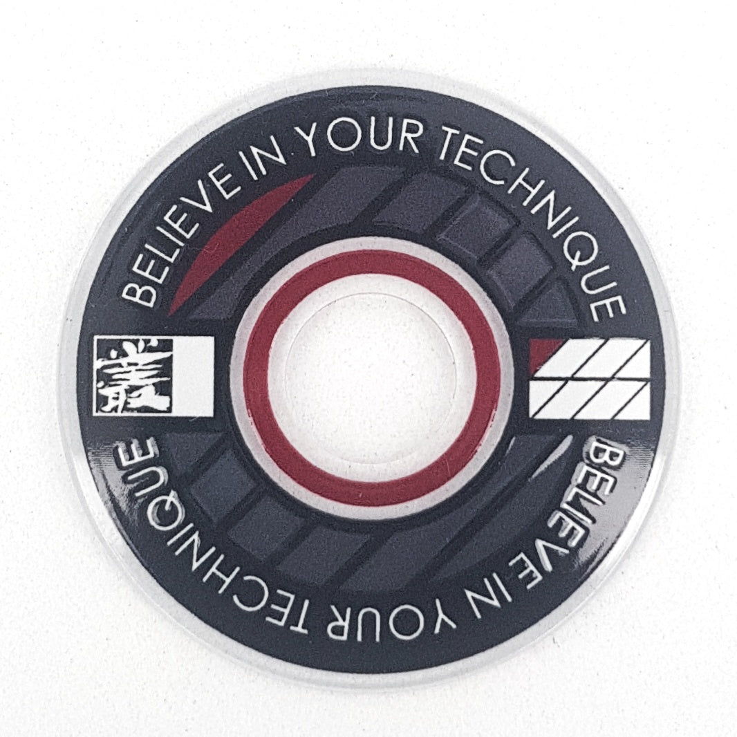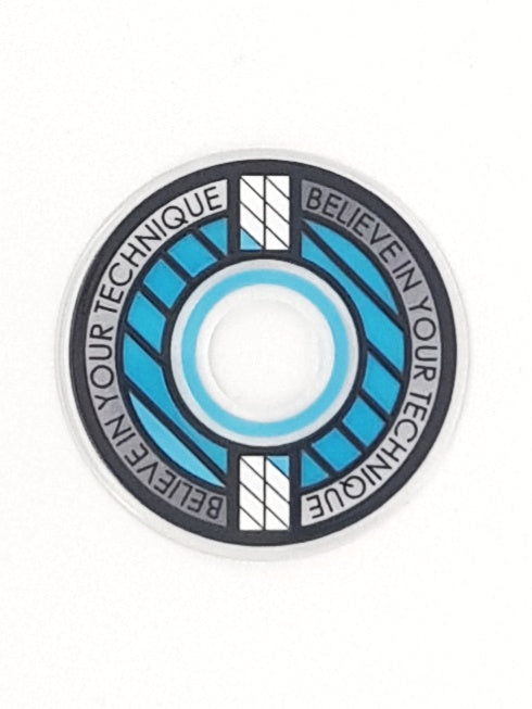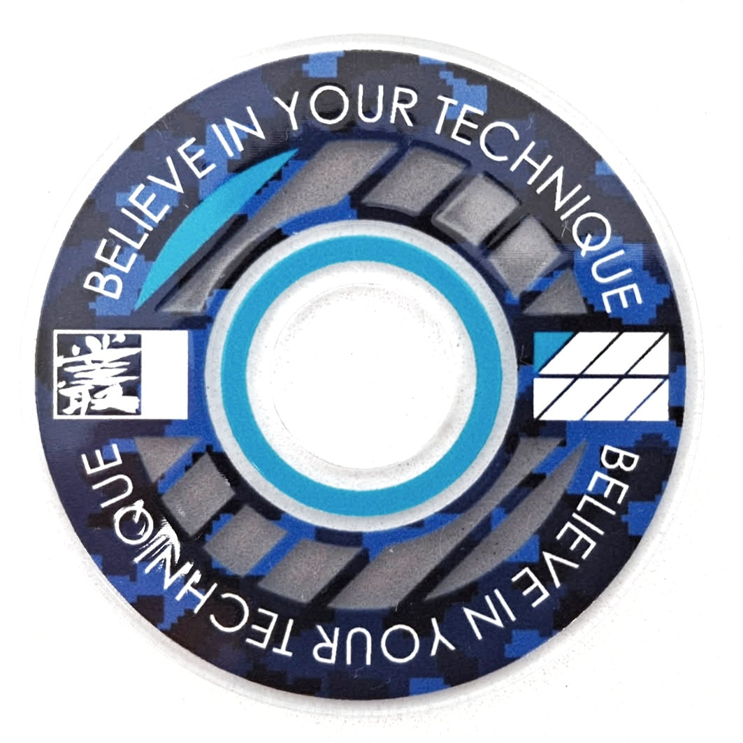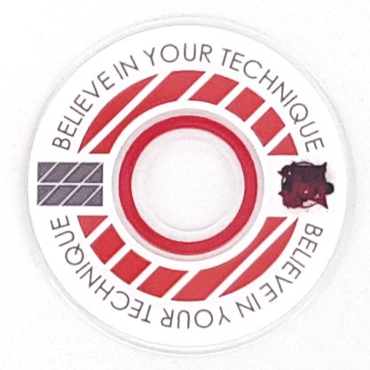 Designed from an outlook to provide a high quality and unique custom arcade accessory, this dustwasher is widely recognised around the world. The key design features are the clear ring near the shaft hole that permits the player to see the joystick pivot as well as the display of a motivational expression ("Believe In Your Technique").