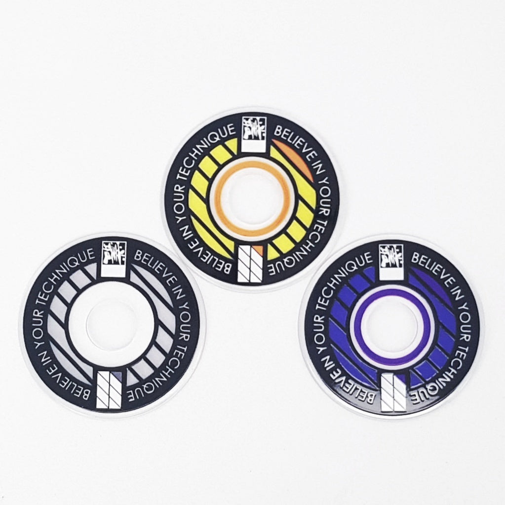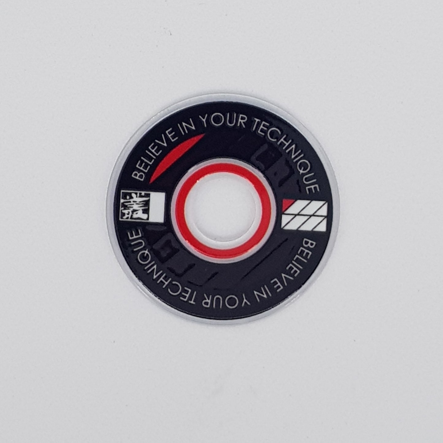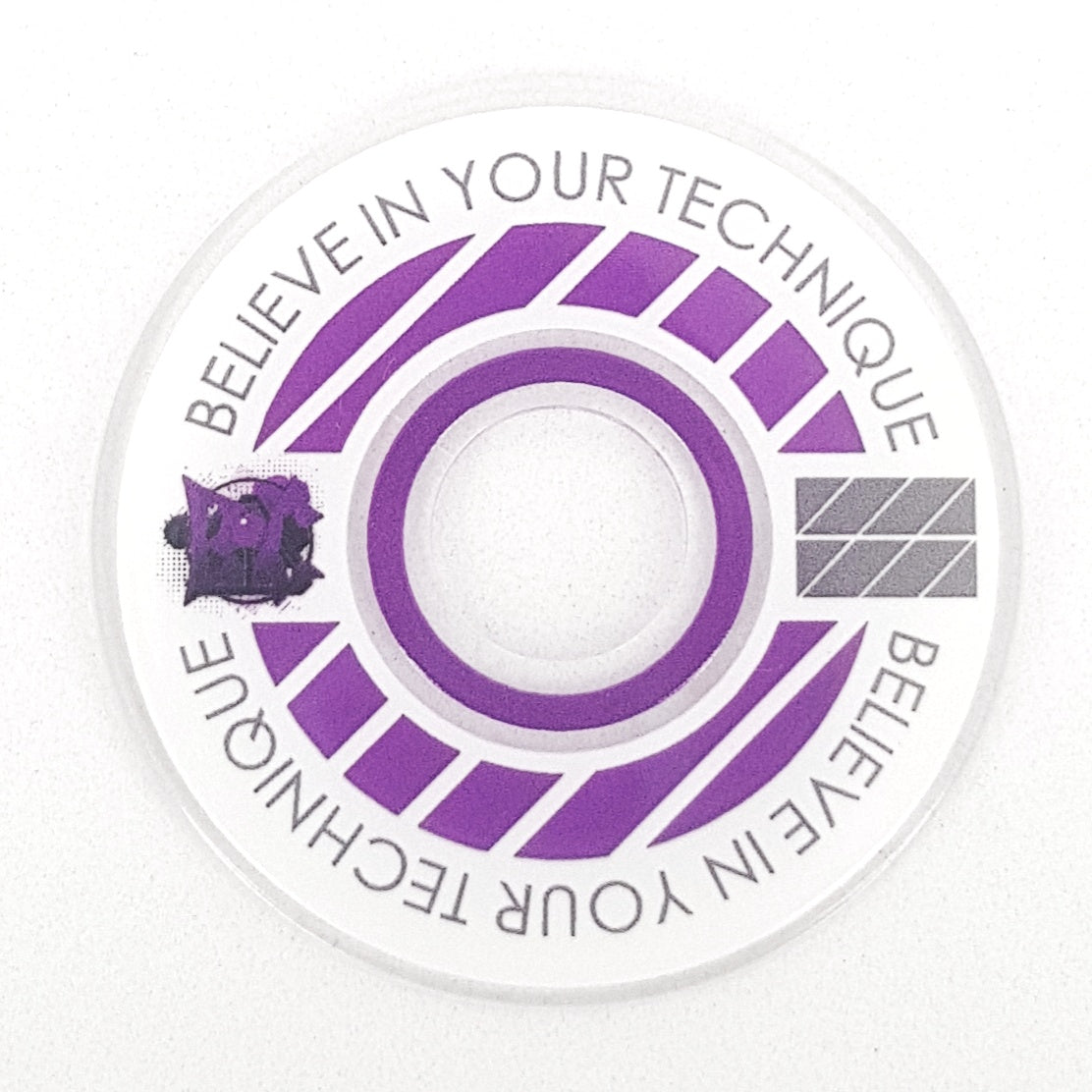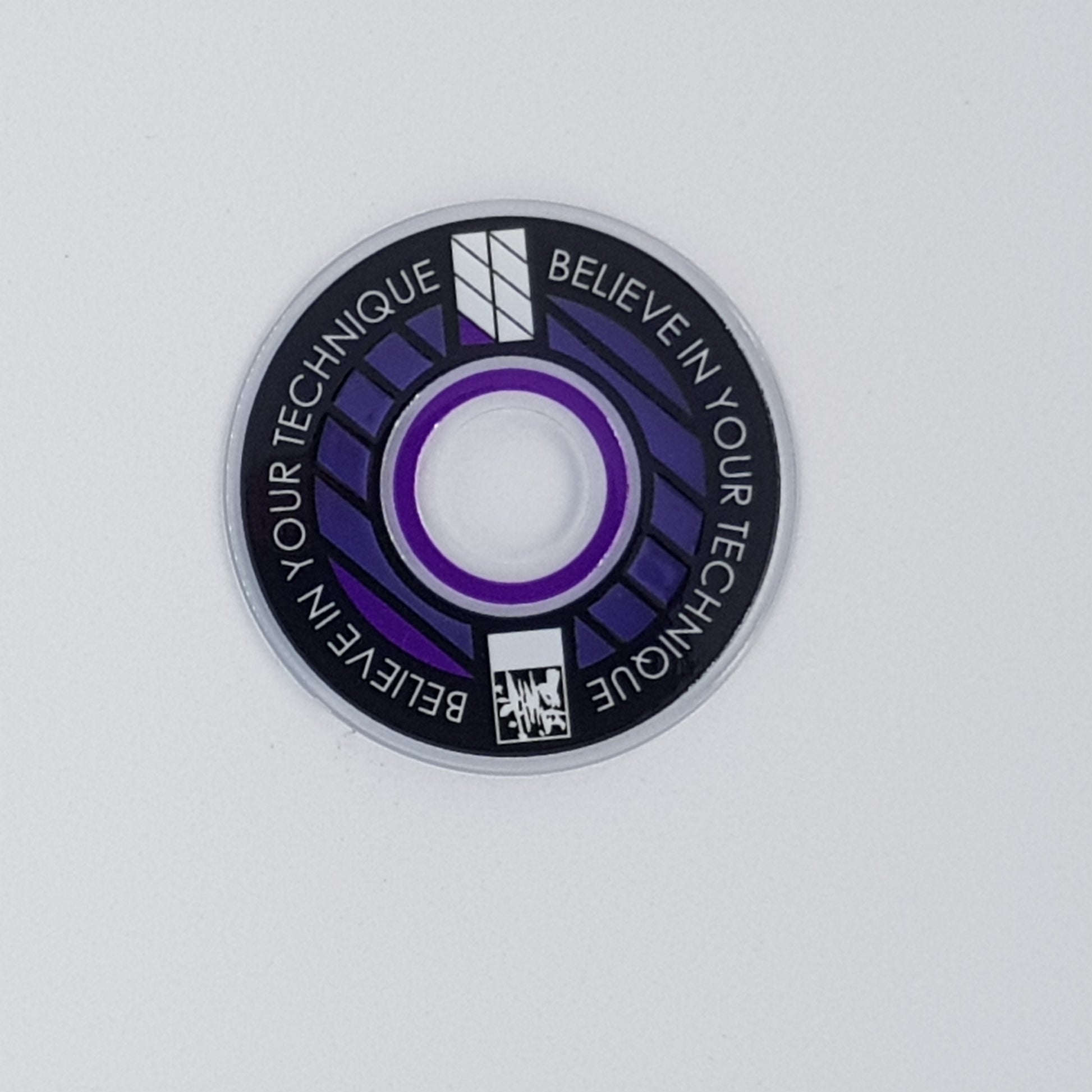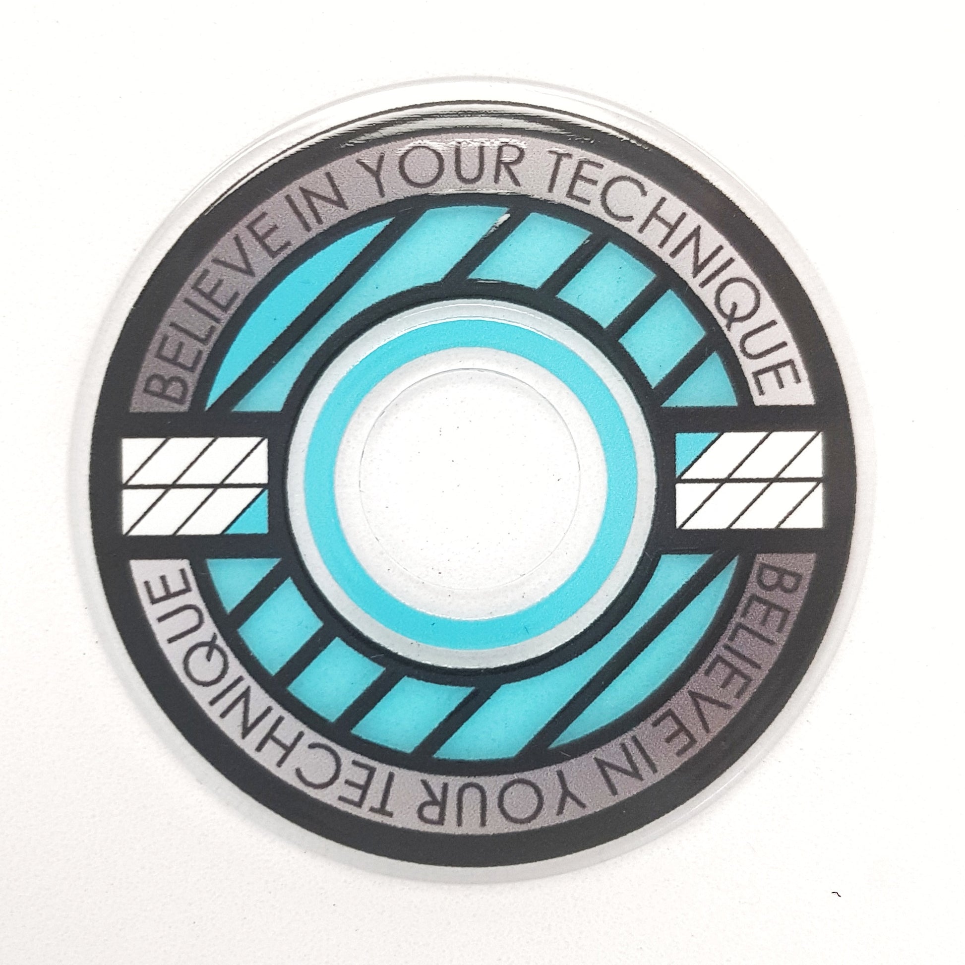 Designed from an outlook to provide a high quality and unique custom arcade accessory, this dustwasher is widely recognised around the world. The key design features are the clear ring near the shaft hole that permits the player to see the joystick pivot as well as the display of a motivational expression ("Believe In Your Technique").
