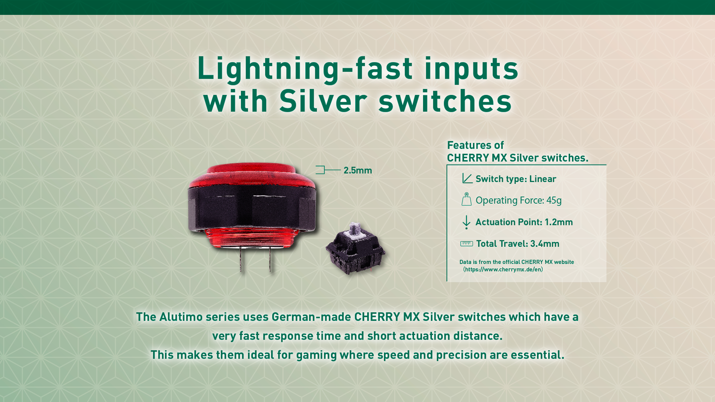 Importantly, the Alutimo pushbutton has a 1mm shim installed from the factory. This feature alone sets the Alutimo button apart from all other MX switch pushbuttons on the market. This design choice mitigates the -0.6mm to +0.6mm (total 1.2mm) movement error tolerance inherent to the Cherry MX Silver switch (two different silver switches for example, might have very different tolerances and therefore respond unevenly).